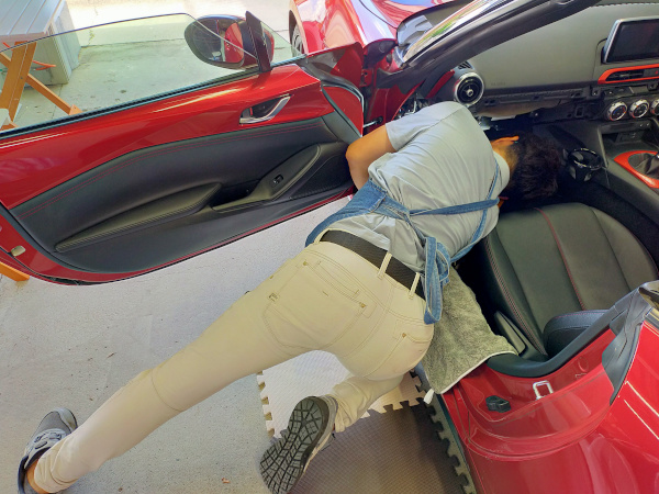 本日はもうすぐご納車の、マツダロードスター君のブロアファンの清掃作業です。NDロードスターのブロアファンは、助手席の左下、御覧の通りのイナバウアーの先にあります。グローブボックスが無い車両のため、Aピラーやステップ、そして助手席側インパネなどの内装パーツを外して、さらにごっちゃりしたコネクター類もはずして、バッテリーも外してやっと届きます。