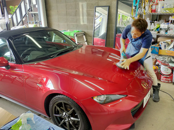 ボンネットもピカピカにしていきます。良い赤色ですね。