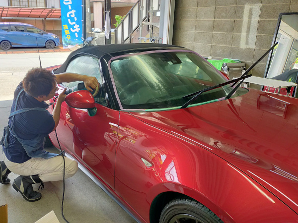 本日もロードスター君のお手入れです。ガラス3面のウロコ取りをしました。ロードスター君の素敵なところは、ガラスが小さく、ボディが低いので施工がしやすいところです( ´∀` )