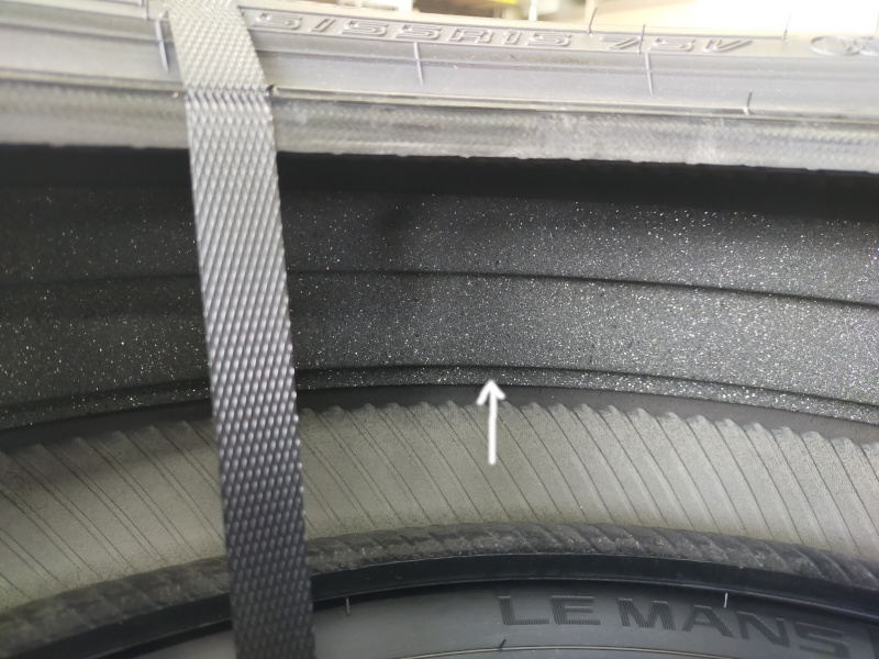 矢印の部分を見てください。タイヤの内側にスポンジが入っています。ルマンとほかのタイヤとの違いは、抜群の静粛性と乗り心地です。タイヤの費用は確かに大事ですが、静かさと乗り心地重視とくれば、私はこれをオススメします。4本交換工賃・タイヤ廃棄量込みで56,000円でした。