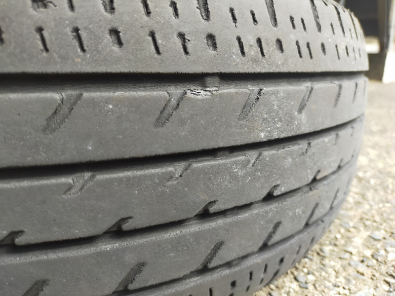 交換した古いタイヤは御覧のとおり。距離は走っていないのですが、2016年製ということもあり、経年でゴムの劣化が見られました。