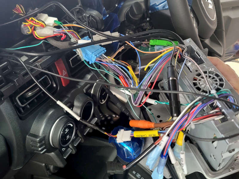 さてさて、いよいよ終わりが見えてきました。後ろから来たカメラ線、GPS線、マイク線、CANケーブル、取付キットの各カプラーを配線していきます。どんな車もそうですが、ナビ裏はスペースがありませんので、各配線の余りは、できれば別場所で納めてからここまで持ってきたほうが良いです。