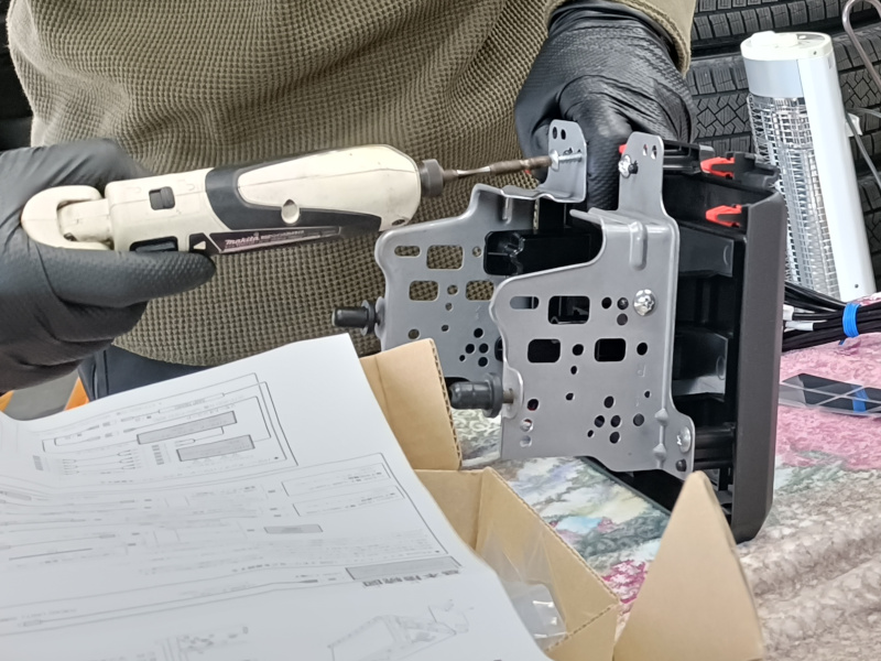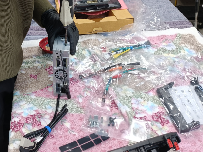 お持ち込みいただいたKTX-F200DAは、取付スペース幅20㎝のサイズの車に18㎝の本体を入れると、余ってしまう隙間を埋めるパーツです。今回は11インチの大型ディスプレイのため、隙間は見えなくなってしまうので、省略は可能か?という印象ですが、せっかく購入されたのでお取り付けしていきます。次は、取付キットを開けていきます。