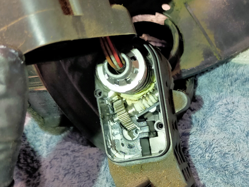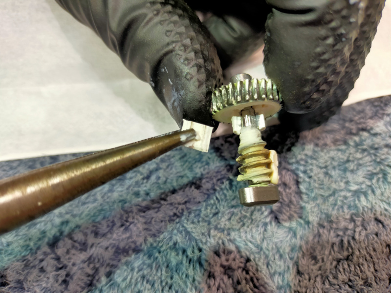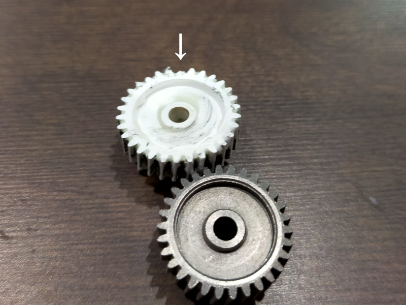 2枚目の画像は、左ミラーのギア、プラスチック製で、ギアの一部が割れて取れていました。軸が空転してずっとウィンウィン音が鳴り続けている症状です。3枚目の画像は、右ミラーのギア、一部が欠けていました。歯車がハマらないと動かないので開いたり開かなかったりという症状が出ていたようです。これを下の対策品の金属製のギアと交換します。