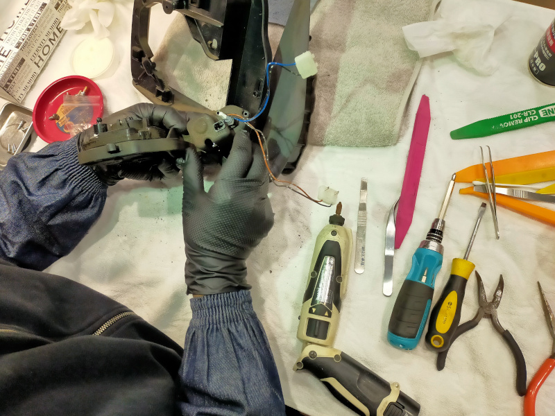 ディーラーさんでは、ミラーごと新しいものに交換するしかなく、修理代は左右で7万円ちょっと、とのお見積りでした。弊社では、ミラーを全部バラシて、モーターギアの交換をして、修理代を安く抑えていきたいと思います。