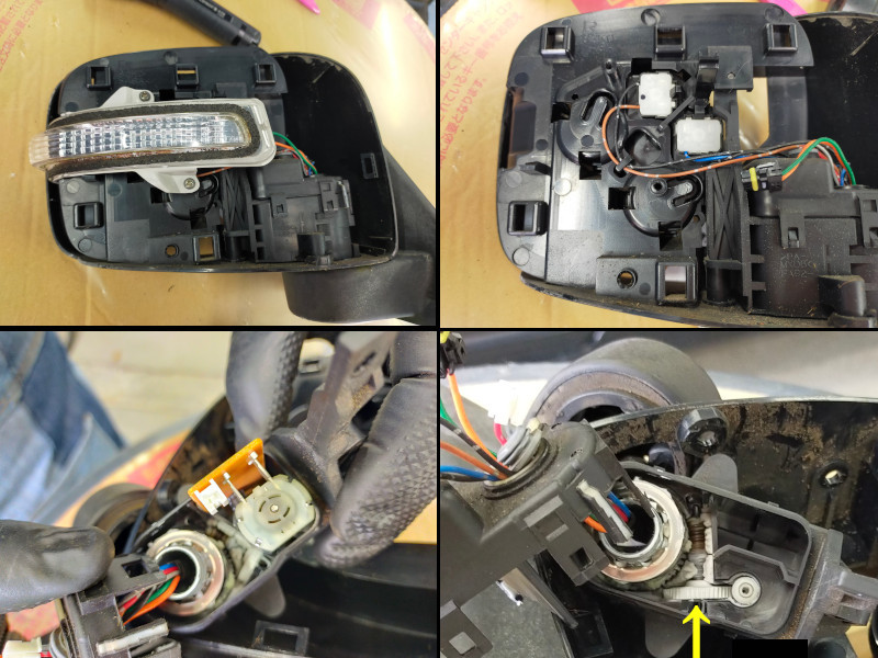 通常ディーラーさんでこれを直すには、ミラーを丸ごと交換するしかなく、4諭吉ほど飛んでいく案件です。今回も、壊れた部分だけを交換する方向で、画像のように分解に分解を重ねて、一番奥底にある黄色い矢印の歯車を取り出します。そしてこれが外れた歯車。プラスチック製のため、経年でひびが入り、芯棒が空転してモーターが鳴りっぱなしになっていました。