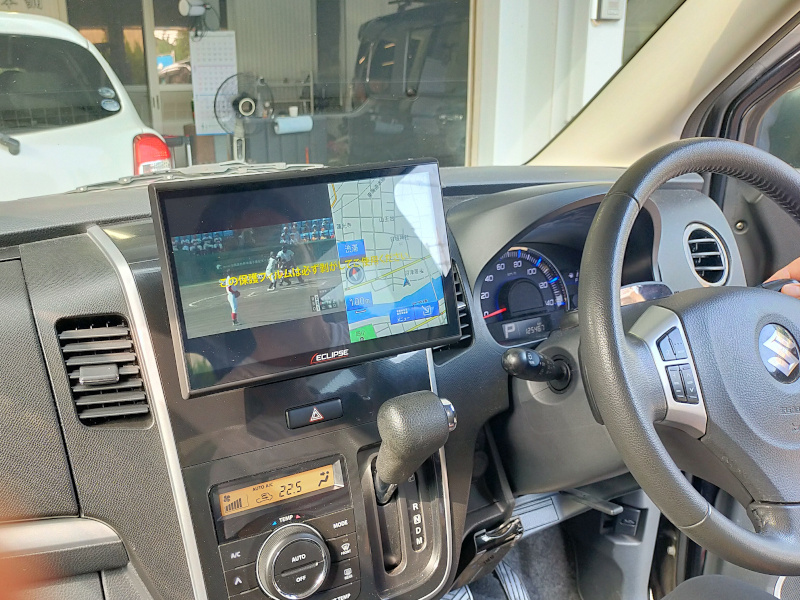 メーカーに問い合わせたり適合を確認してみると、MH23Sスティングレーは8インチのフレームの設定が無く、ワイドも存在せず難しいこと、9インチ以上となると、フローティングとなること。9インチか10インチでお客様のご予算的なものもあり、私の提案でイクリプスの10インチフローティングではいかがでしょうか?とお伺いし、ご承諾を得まして本日お取り付け完了となりました。