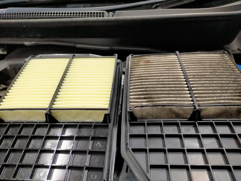 汚れると何も良いことがありません。今回はもの凄く分かりやすいビフォーアフターの写真が撮れました( ´∀` ) エアフィルターは5万キロごとの交換推奨となります。車検などでもは見落とされがちな部品のため(交換しなくても車検は通るので)、5万キロ、10万キロあたりの走行のかた、整備で交換されてたかな?とチェックしてみてください。