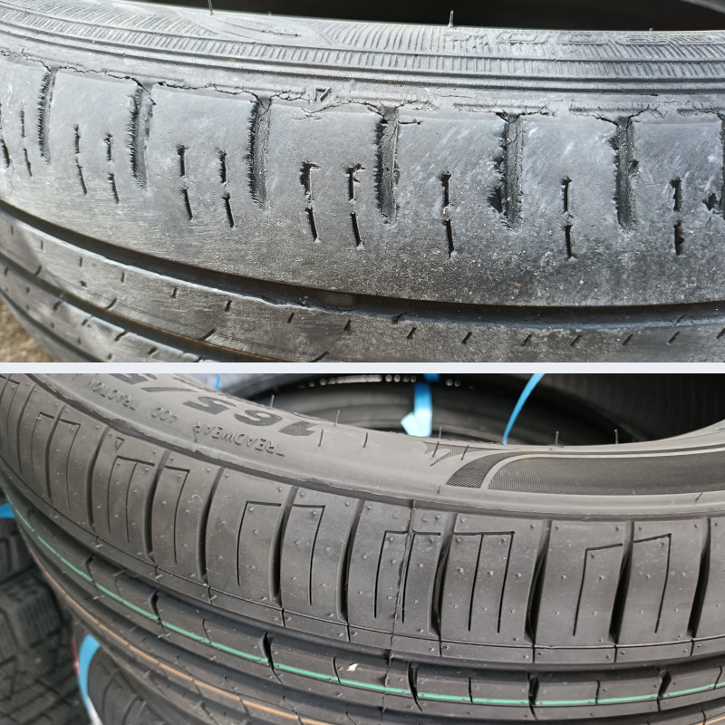 溝は残っていますが、ゴムの寿命が来て、ヒビ割れが起こっています。こちらは、輸入タイヤで2025年製4本、34,000円で交換させていただきました。もちろん工賃も、新品バルブも、廃棄代も込みです。
