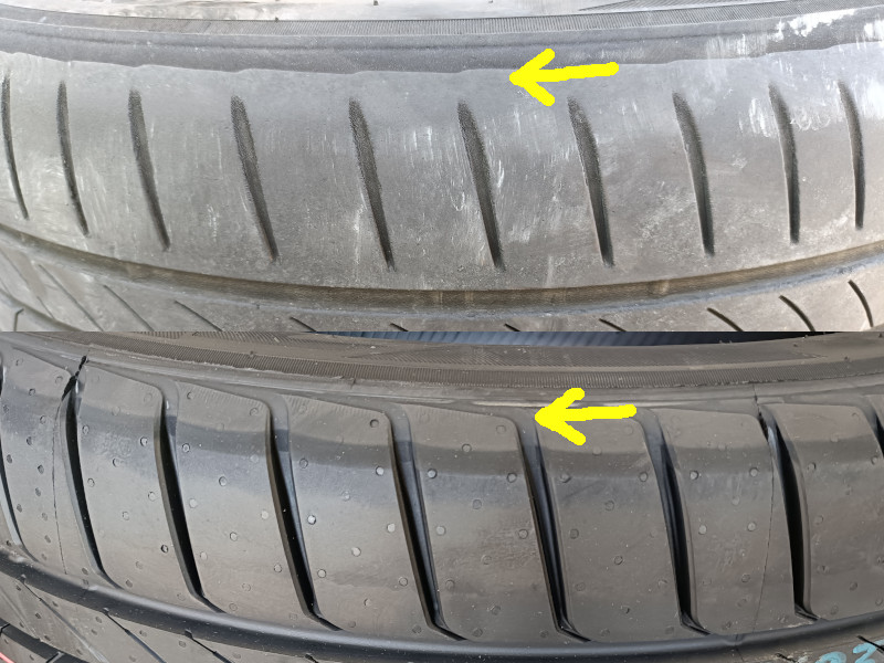 ショルダーは矢印の部分です。下は新しいタイヤですが、タイヤの「きわ」まで溝が入っていますよね。タイヤの溝は、スリップサインのある円周方向の溝だけでなく、ショルダーの溝も見て交換時期をさぐってください。特に雨の多い季節は命取りとなります。ご確認ください。
