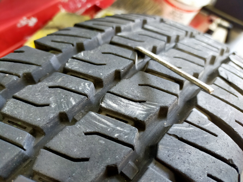 本日は、グーピット経由のタイヤ交換のご依頼が入りました。アマゾンでタイヤを購入すると、近くのタイヤ交換店をグー経由で予約できるというシステム。本日は、左のような金属棒が刺さったタイヤの交換作業で、沼津市の法人様がおみえになりました。ありがとうございます。スペアタイヤをはいておられたので、それも戻して1時間弱で作業終了です。また何かありましたら、ぜひ当店をご利用くださいませ♪