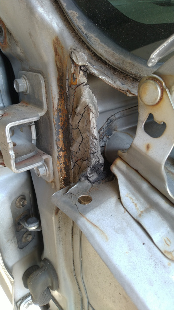 フェンダーを外して、ボンネットの付け根を確認すると