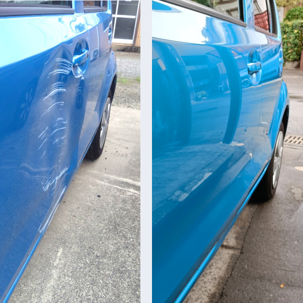 ディーラーさんですと、新品のドアと交換しますので、おそらく15枚以上の渋沢さんが飛んでいきます。またドア下の部分も新品交換しますとさらに10枚ほどが飛びます。が、弊社は今回、10渋沢と少し、で修理させていただきました。(ちなみに、ドアの下のところはお客様のご希望で塗装のみ、板金はしませんでした。そちらの磨き塗装代も含めての金額です)