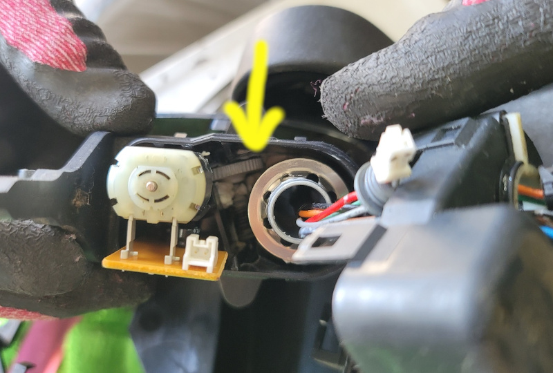 事の始まりは先々週。「車から”ガガガガガガッツ”という音がずっと鳴っていて、今、急に始まったのですが、なんで鳴っているのか分からなくて(涙)、とっても怖いので、今から見せに行っても良いですか?」とお電話がありました。すぐにご来店いただき、見てみると、どうやら左のドアミラーのモーター音・・・。これ、スズキ車あるあるのモーターギアの破損ではないかと思い当たりました。黄色い矢印の奥にある白い歯車です。