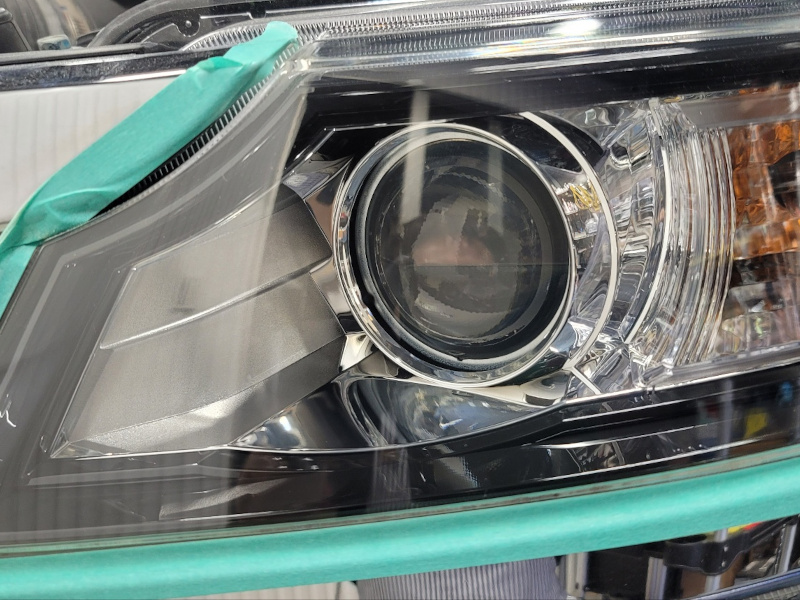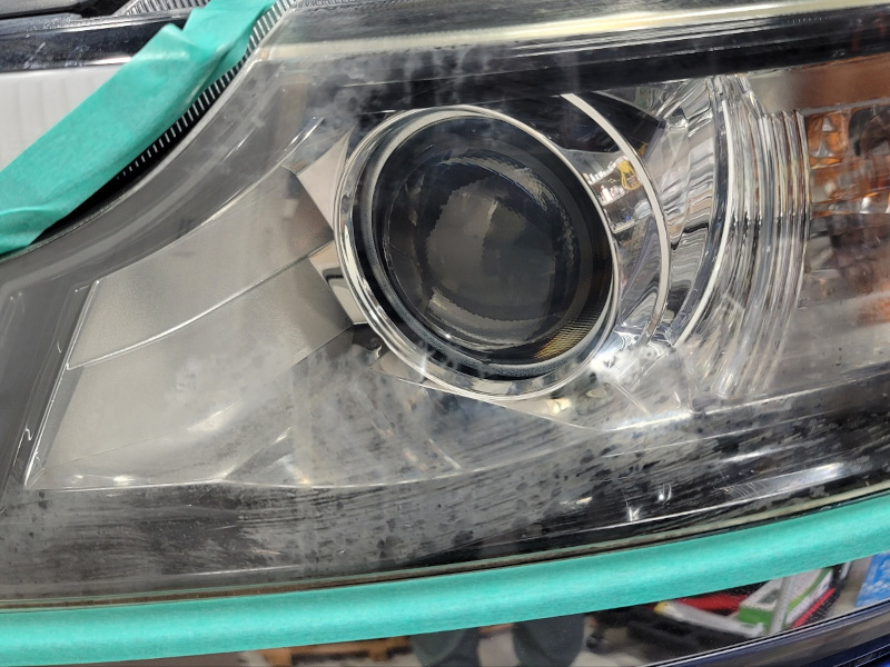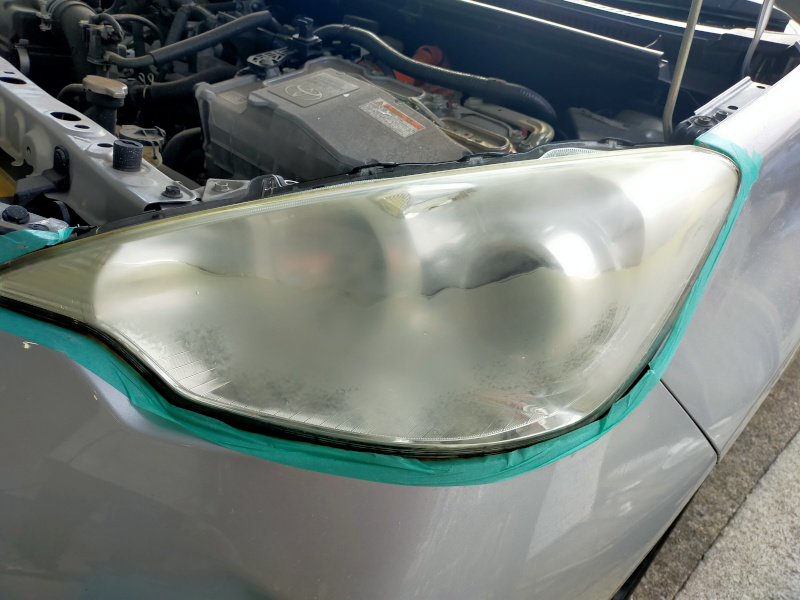 これはH25年式のアクアです。左右とも曇っていましたが、特に左が重症でした。クリアがベロンと剥がれて割れていて、他もかさぶたのよう。