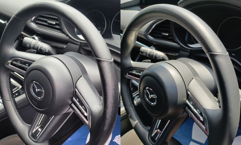 先週、三島市のお客様より買取させていただいた、令和2年式のマツダ3。走行は2万キロ台なのですが、ステアリングが剥げています。