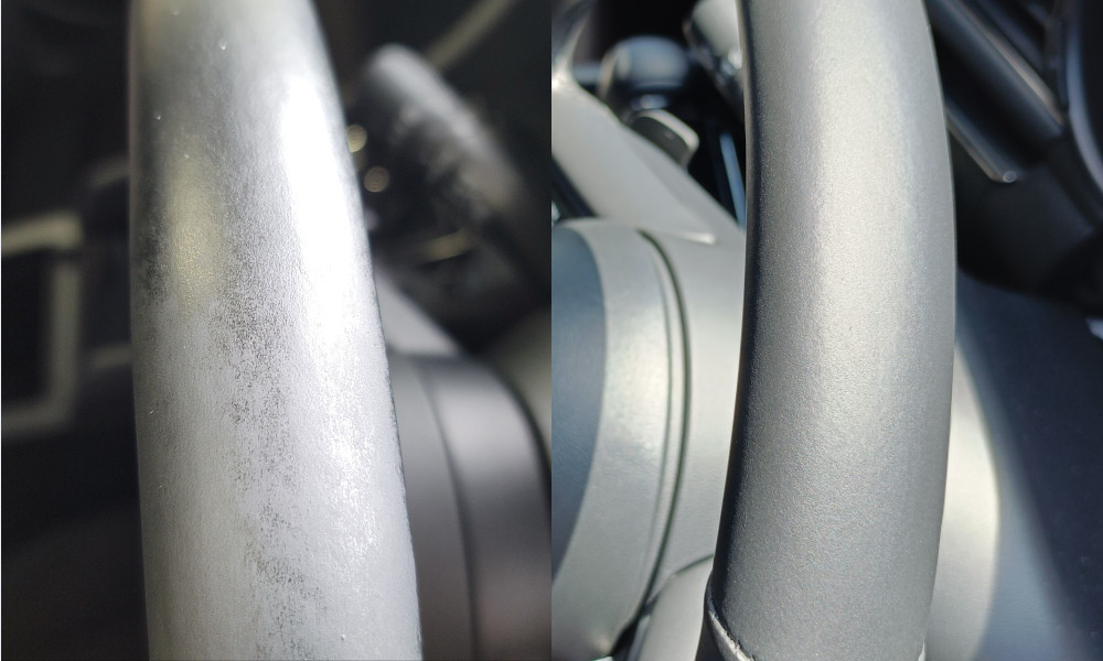 お客様は、昨年このお車を中古でディーラーから買ったとのこと。このハゲの原因が何だったのかはわかりませんが、昔はよくステアリングを靴墨で修復したと聞きました。なるほどこういうことかと、今回とても勉強になりました。