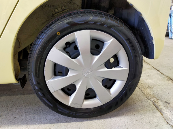 本日は富士市のT様より、ミライースのタイヤ交換のご依頼をいただきました。弊社では ①コスパ重視輸入タイヤ ②安心お安め国産タイヤ ③エコなワンランク上の国産タイヤ と、お客様のニーズに合わせてタイヤのグレードをご提案しています。お見積りのご来店の際に、タイヤのグレードを選択していただき、タイヤの入荷を待って交換させていただきました。今回は①でお願いしますとご依頼いただきました。