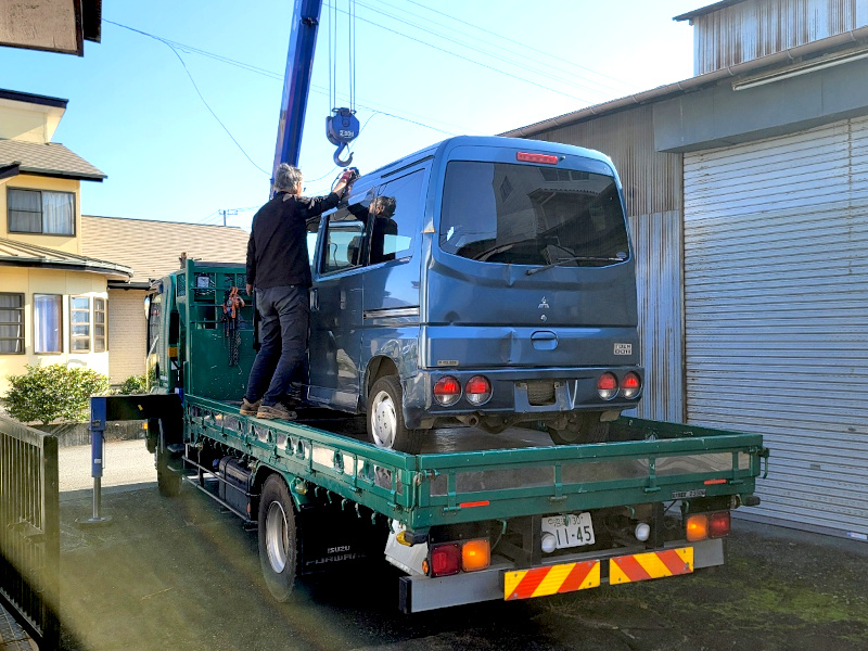 本日は、伊豆の国市の不動車の引き上げでした。ご依頼いただいたのは弁護士の先生からで、財産管理でこちらのお車の価値を判断してほしいとのことでした。事前に現地で査定させていただき、金額をお伝えしたところ、ご了承をいただいた次第です。