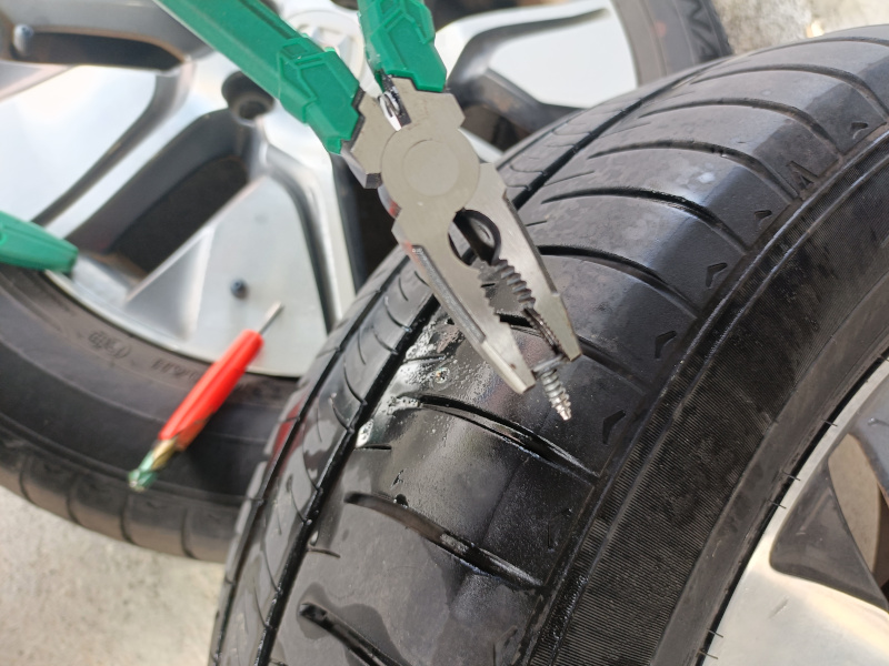 刺さっていたのはこれ。ネジ自体の長さが短かったので、タイヤの内部にうっすら貫通するぐらいで、空気の抜けもほぼありませんでした。パンクは、修理できる場所と出来ない場所があります。今回は修理できるところで貫通も薄かったため、外面修理2,000円で完了です。安く済ませるのがモットーです( ´∀` )
