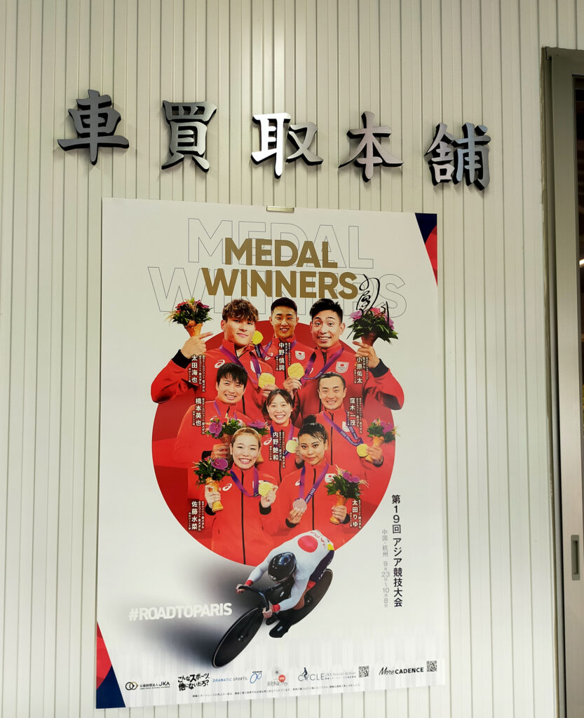 弊社のお客様で、自転車競技ナショナルチームの小原佑太さんが、久しぶりにご来店くださいました。先月のアジア大会自転車競技のチームスプリントで見事金メダル!!となった記念のポスターを片手に\(^_^)/スバラシイ