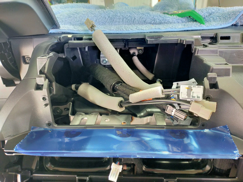 つづきです。こちらの写真、新型フリード(GT型式)のオーディオレス車です。オーディオの穴には、本体からカプラー(配線)がたくさん来ています。オーディオハーネス24P、GPS、テレビアンテナ、ラジオ、ステアリングリモコン、バックカメラ、など。これらとお客様が購入されたパイオニア カロッツェリアのDMH-SF700を繋いでいく作業になります。