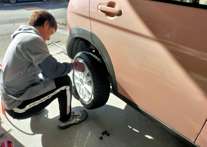 お次は、御殿場市のN様よりアルトラパンのサマータイヤからスタッドレスホイールセットの脱着のご依頼をいただきました。本来は、ご主人が毎年年末に作業されるそうなのですが、12月の中頃に腰を痛めてしまって、そこから