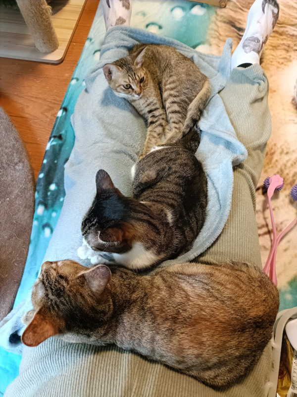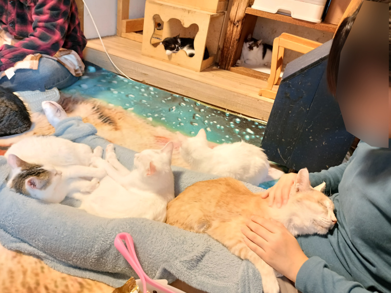 座ったと同時に、足の間に猫が鎮座してくださいます。そして両脇にも。撫でたい人間と撫でられたい猫(多数)が同空間にいる素晴らしい世界でした。手が足りないというのは、こういう場面でも使えるのかと。
