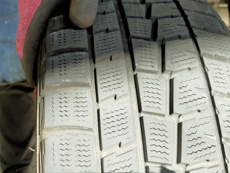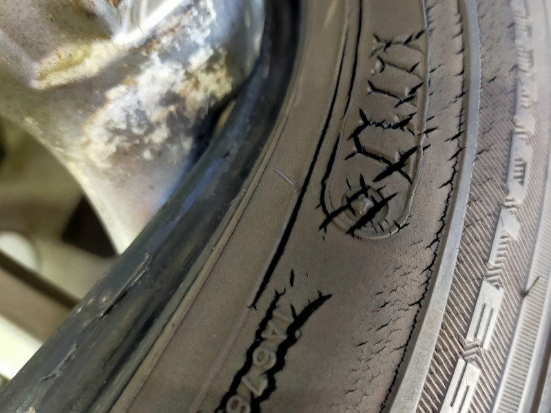 山梨や長野方面へお出かけされることが多く、冬になるとスタッドレスが必須となるそうで、現在履いているスタッドレスは5年前のもの。溝はまだありますが、外してみると縦ヒビが出ています。横はこんな感じ。ご寿命でございます・・・。
