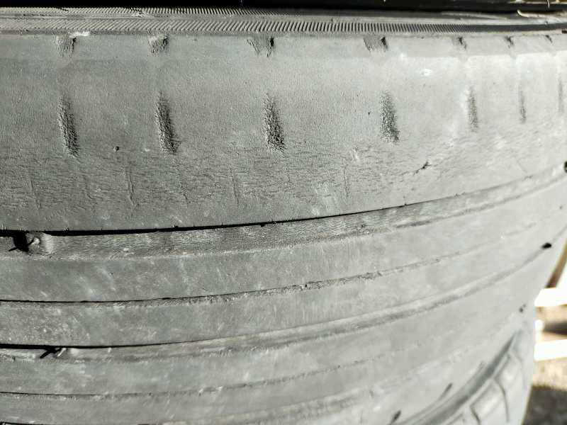 タイヤは会う人会う人に「つるつるだよ」と言われたとのことで、替えた方がいいですか?( ;∀;)、と。確認してみますと確かに、つるつる。「つるつる」という表現が、難しいですよね。このタイヤを見てまだ溝あるじゃんって思うのもわかりますし、見る人が見ればショルダーの部分の溝無いですからこれは「つるつる」なわけです。